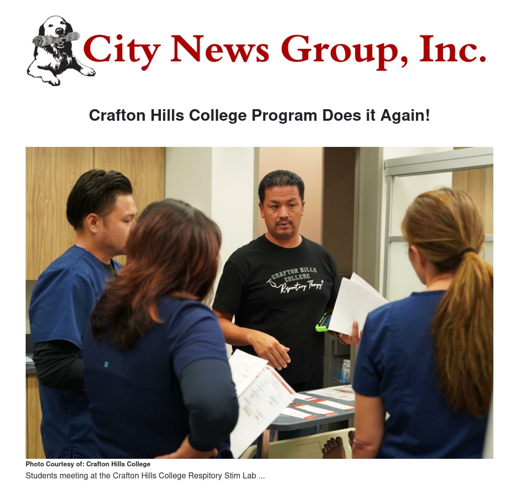 Crafton Hills College Respiratory Care Program has once again received the Distinguished RRT Credentialing Success Award from the Commission on Accreditation for Respiratory Care (CoARC), representing several consecutive years of national recognition for student outcomes.