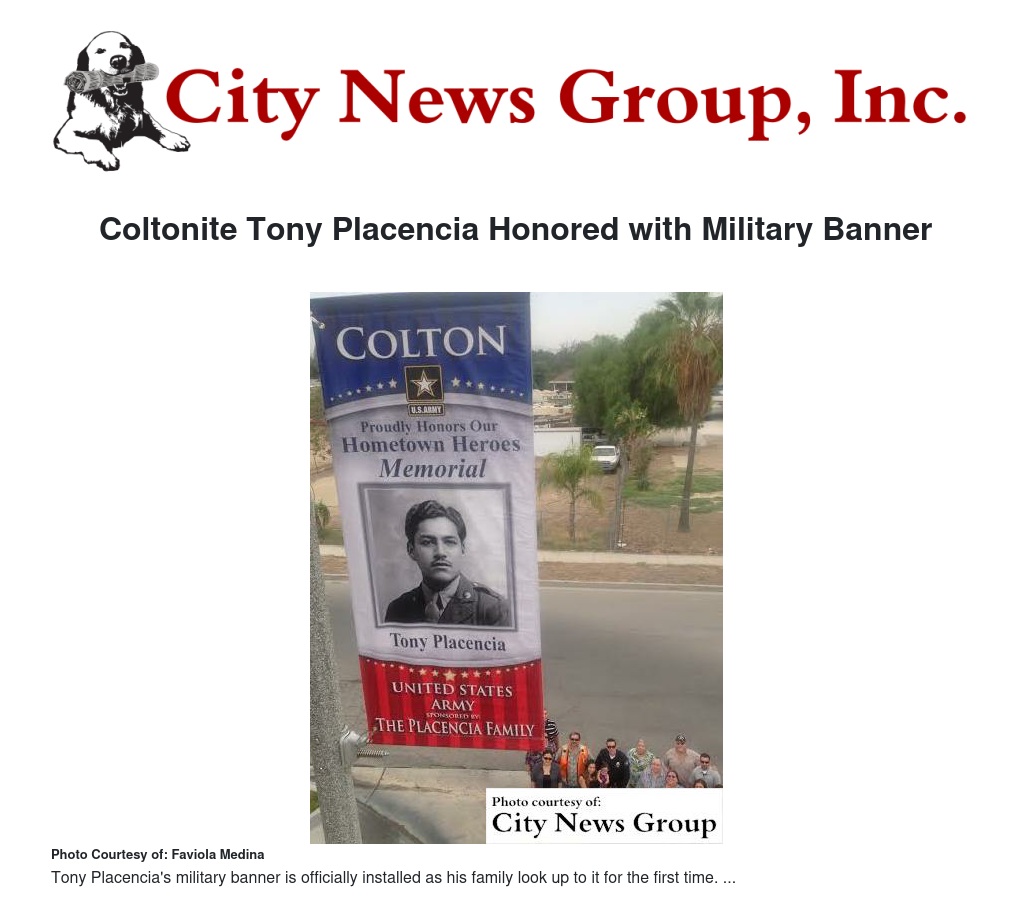 Coltonite Tony Placencia was honored by his family, friends, and his hometown of Colton with his very own Military Banner Installation Ceremony this past August.