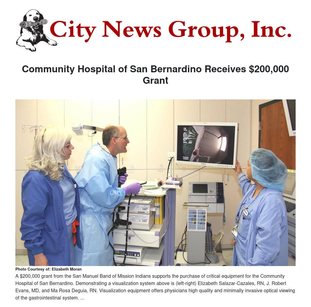 The Community Hospital of San Bernardino Foundation received a grant from the San Manuel Band of Mission Indians towards the purchase of critical hospital equipment.