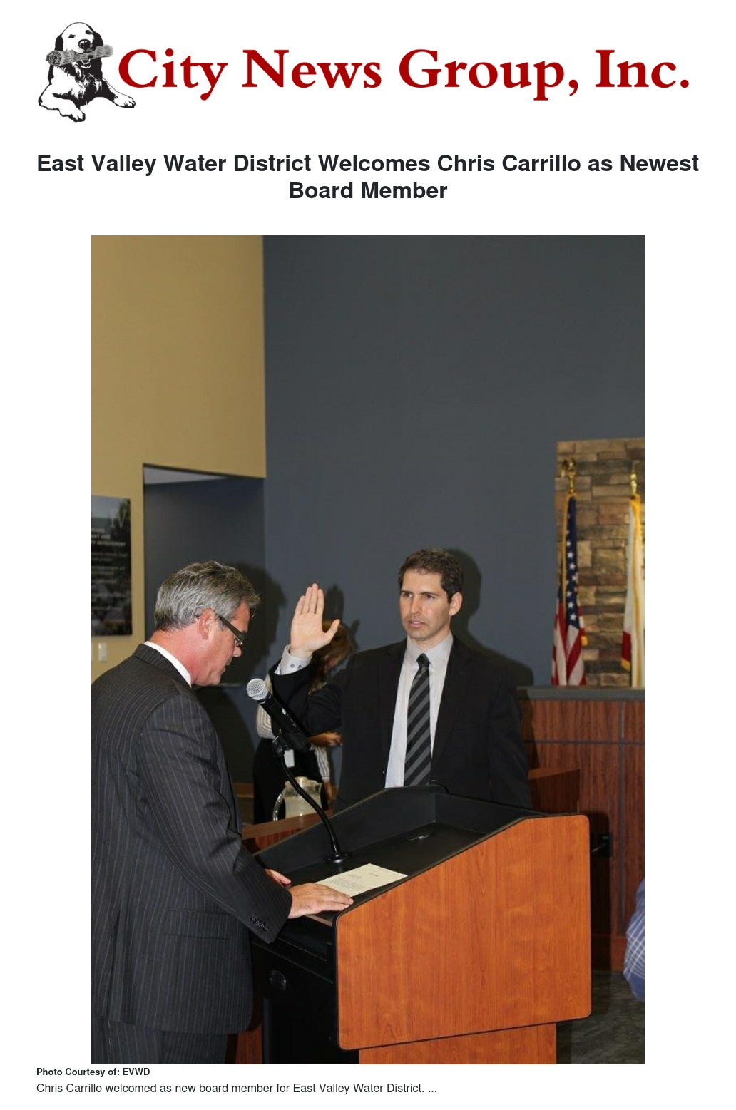 "We are very pleased with the level of experience and professionalism that Board Member Carrillo brings to East Valley Water District," said Chairman James Morales, Jr. "The District took great care to conduct a fair process that encouraged a high level of community engagement."