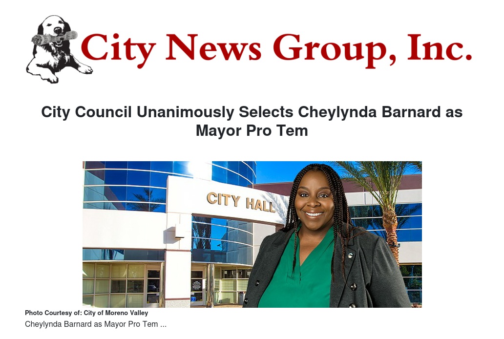 "I am honored and grateful to hold the title of Mayor Pro Tem, and I would like to thank the City Council and the Moreno Valley community for their confidence in me," said Mayor Pro Tem Barnard. "I will continue to dutifully represent the City I call home and work collaboratively with my colleagues on the Council to ensure our community continues to thrive."
