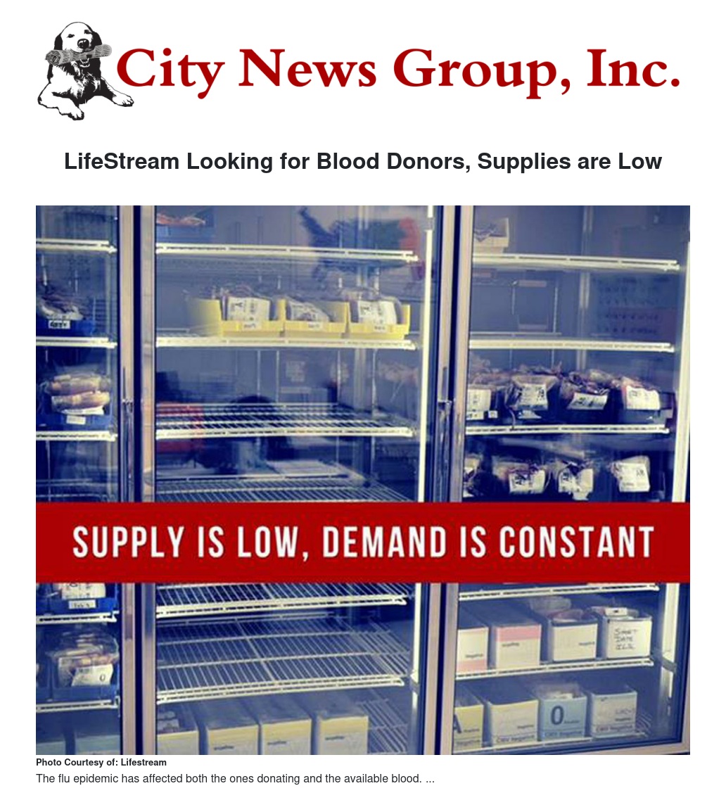 LifeStream, an Inland Blood Bank, is asking for blood donations from all people who can give because their blood supplies have been nearly depleted, and those donors who give regularly may have contracted the flu virus which makes it impossible for the donation center to accept any blood from anyone with this kind of illness. Spokesman Don Esclante has been reported as saying that San Bernardino-based LifeStream is down to one-day supply of O-negative, O-positive, and B-positive blood as of last week. That is the approximate amount needed to supply about 80 Southern California hospitals for their daily needs. Because of the flu epidemic, it has affected the number of both donors and available blood. The demand has risen during the winter months, as always, not to just one issue or another. There is always a steady need for blood for unexpected emergencies and unexpected multiple injuries due to vehicular accidents. Two of the local walk-in centers for donations are: