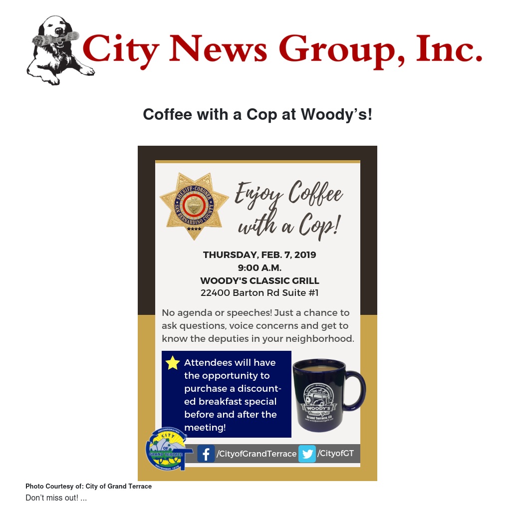 Don't Miss Coffee With A Cop, 9AM Tomorrow Morning, at Woody's Classic Grill!