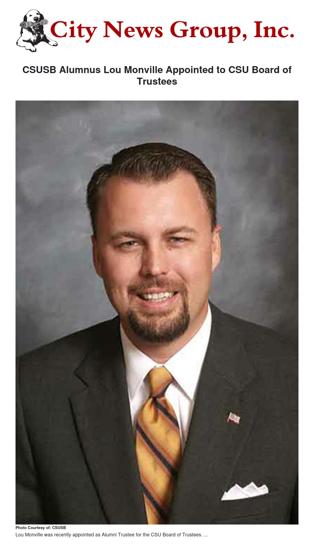 Lou Monville, a graduate of California State University, San Bernardino (CSUSB) who has a long history of service to the university and the Inland Empire, has been appointed to the California State University Board of Trustees as the Alumni Trustee.