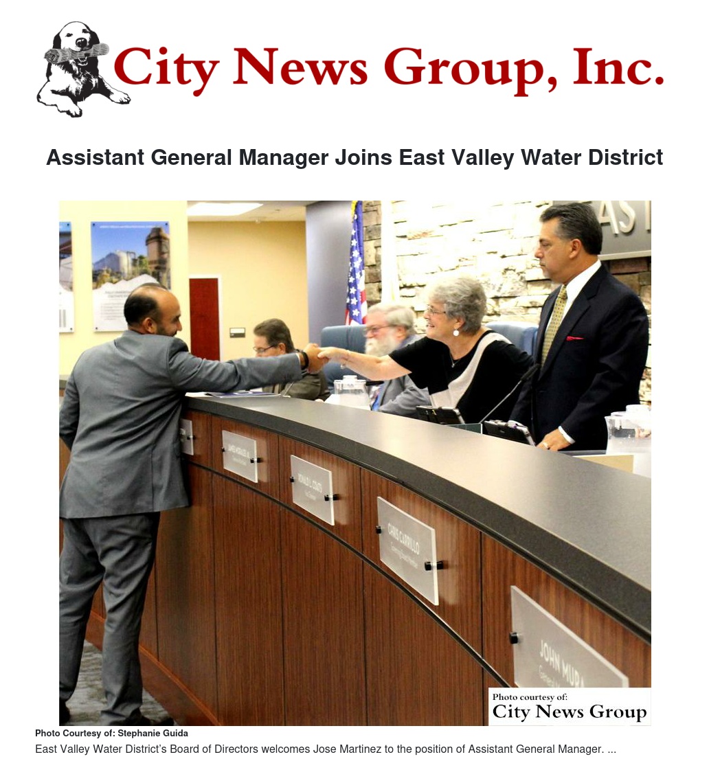 Jose Martinez joins East Valley Water District (District) Tuesday, Oct. 13, as the new Assistant General Manager. Mr. Martinez has more than 20 years of experience in the water industry, having served customers from both the field and office environments.