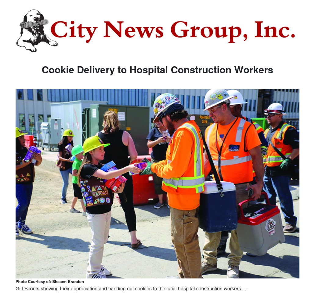 The Girl Scouts Grand Terrace Troop 76 delivered 800 boxes of their famous cookies to construction workers on the building site of the new Loma Linda University Medical Center and Children’s Hospital towers, on Thursday, April 25. The troop of 14 girls braved 90 degree heat for more than an hour to personally give each construction worker a box of cookies as their way to say thanks for building the new hospitals. One of the troop’s scouts, Ava Firnkoess, 9, said she suggested the activity because she was inspired by the construction workers’ dedication and teamwork.