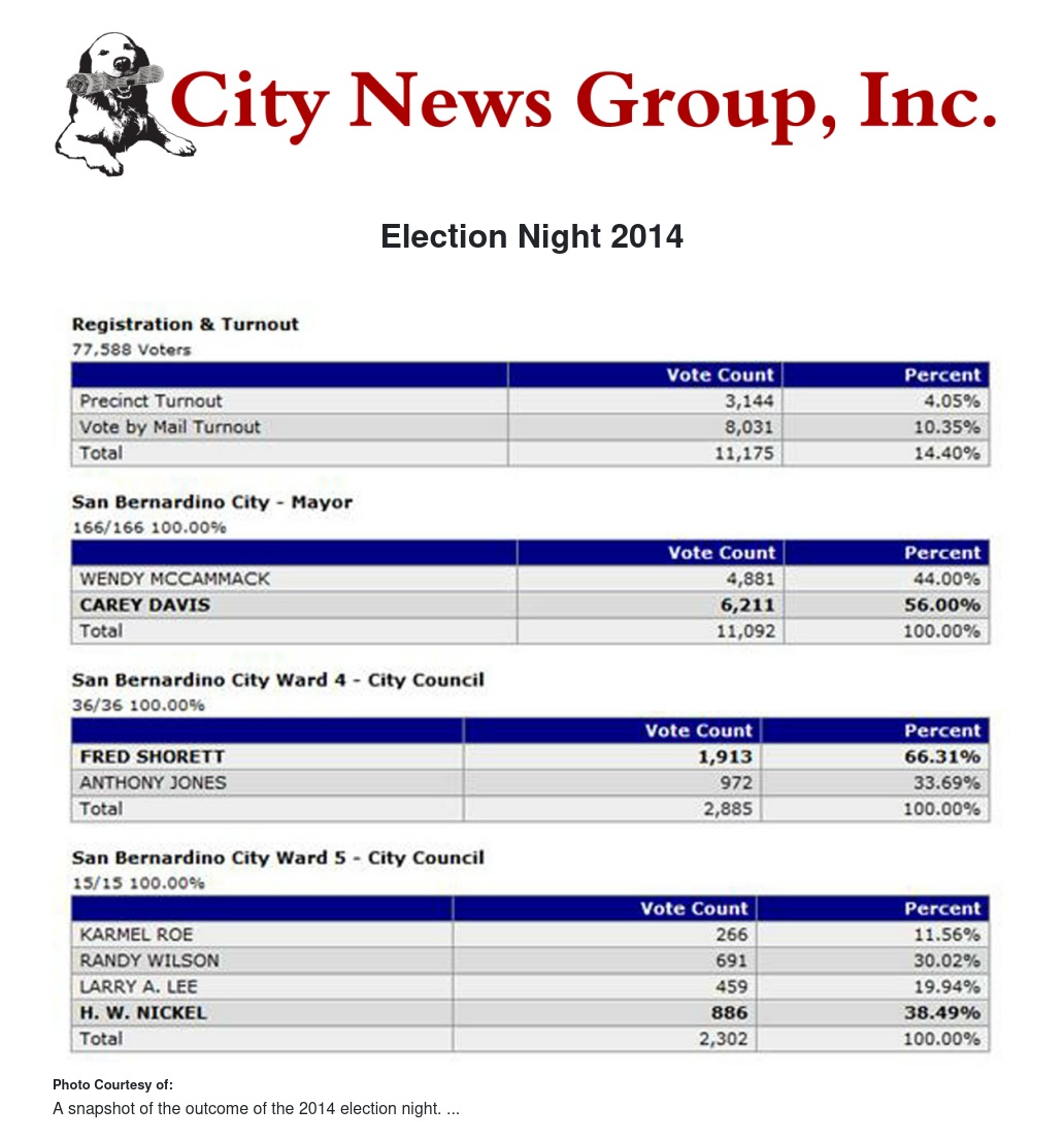The night of February 4, 2014 may go down in San Bernardino history as a historic election. After several long months of campaigning that began in 2013, the final election results showed that the citizens have chosen a new mayor, Carey Davis, beating his challenger Wendy McCammack. Mayoral elect Davis garnered 6,211 votes (56%) over McCammack’s 4,881 (44%) votes. In the city council races, Fred Shorett swept Anthony Jones in a landslide victory with 1,913 votes (66%) over his opponent’s 972 votes (33%), and Henry Nickel won in the 5th ward, accumulating 886 votes (38%) over several of his challengers.
