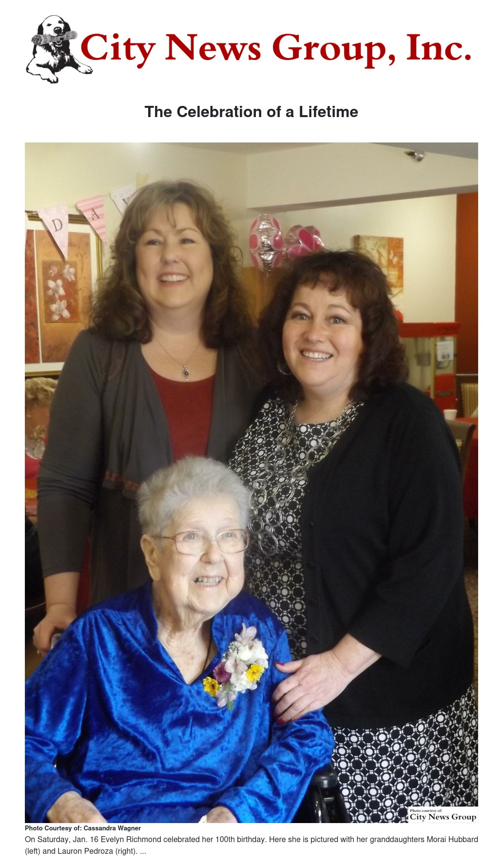 On Saturday, Jan. 16 community leaders, friends, and family gathered together at Brookdale Assisted Living Center to celebrate the 100th birthday of Evelyn Richmond. The party was given by her granddaughters Lauron Pedroza and Morai Hubbard.