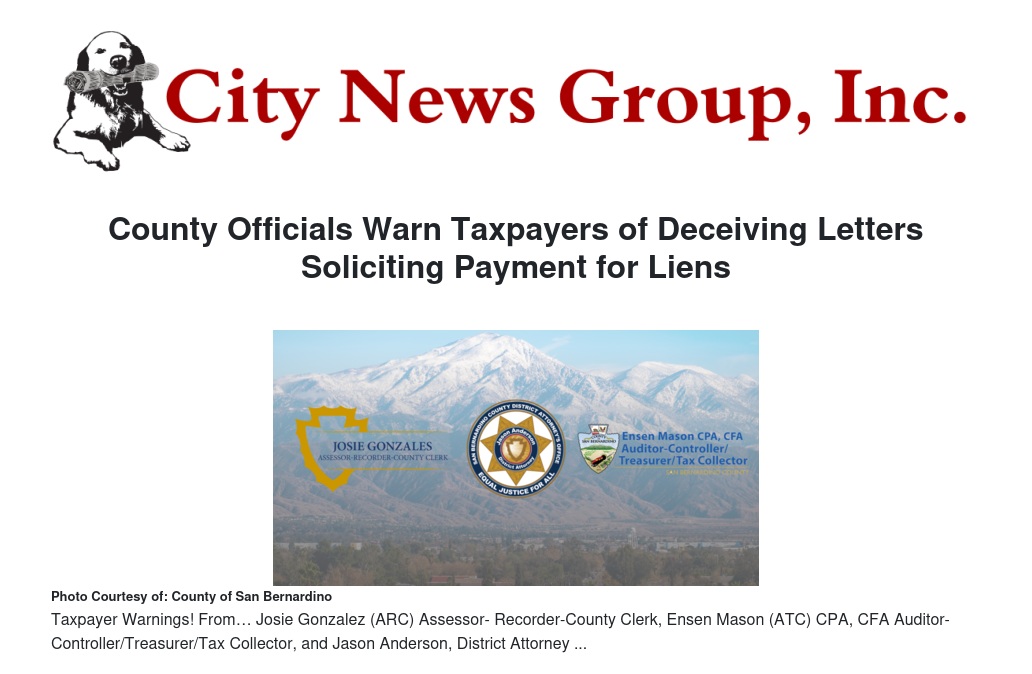 County Officials Warn Taxpayers of Deceiving Letters Soliciting Payment for Liens by Ruby Stephenson - City News Group, Inc.