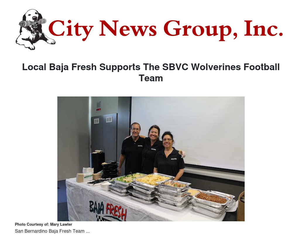 San Bernardino (CA) - A strong team is built upon strong players, strong coaches, and a strong appetite for victory - and Baja Fresh, that is. For Dustin Currie, GM of the San Bernardino Baja Fresh, his love for the game of football is only surpassed by his love of quality food. Which is why he decided to support the San Bernardino Valley College Wolverines by providing meals to the team before their big home games.
