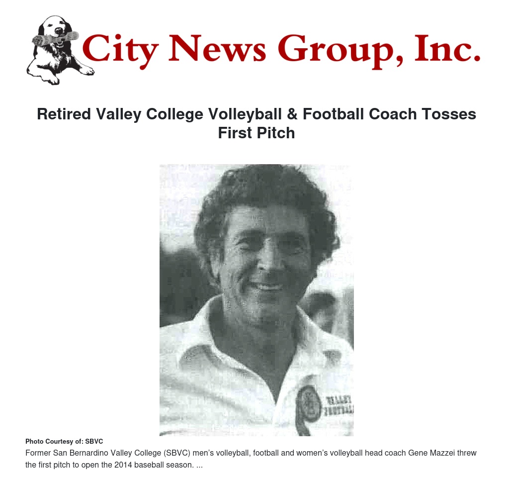 Former San Bernardino Valley College (SBVC) men’s volleyball, football and women’s volleyball head coach Gene Mazzei threw out the ceremonial first pitch during the SBVC men's baseball game versus the Compton Tartars, opening up the 2014 baseball season on Tuesday, Jan. 28.