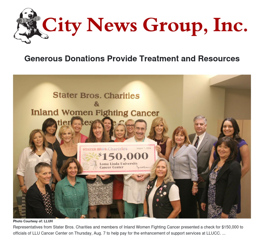 Patients receiving treatment at Loma Linda University Cancer Center (LLUCC) will receive enhanced support services, thanks to a gift of $150,000 from Stater Bros. Charities and Inland Women Fighting Cancer (IWFC).