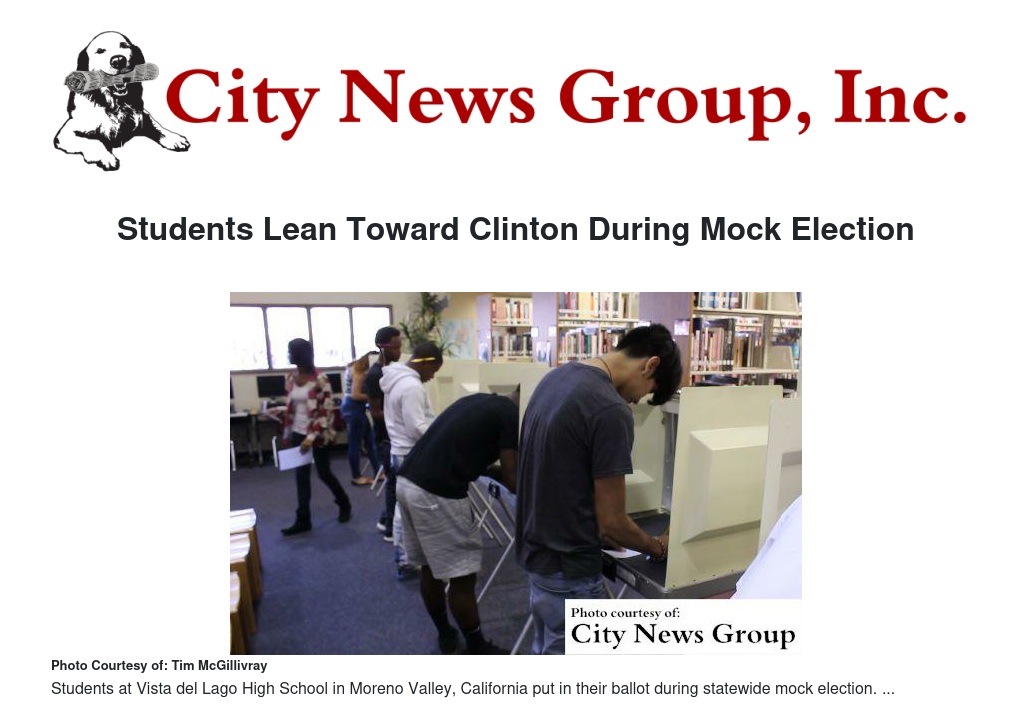 The results of their mock election included a landslide victory for Democratic presidential nominee Hillary Clinton for president at 70 percent, along with overwhelming support for taxing cigarettes and banning single-use plastic grocery bags statewide.