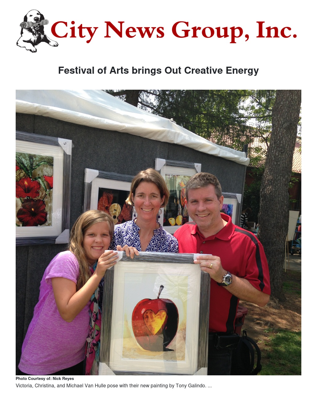 Artist Greg Clark said, “I didn't even know there were cash prizes.” His works with brass, copper, and aluminum won a $1,000 first-place prize. Artist Brad Faegre, who painted many of his pieces in Redlands, came for the second year in a row. He said, "Art is craft you have to put thousands of hours into." Christina Van Hulle came with her husband, Michael, and daughter, Victoria. Christina bought an art piece featuring an apple with a heart in it. She said, "Teachers are the heart of the future."