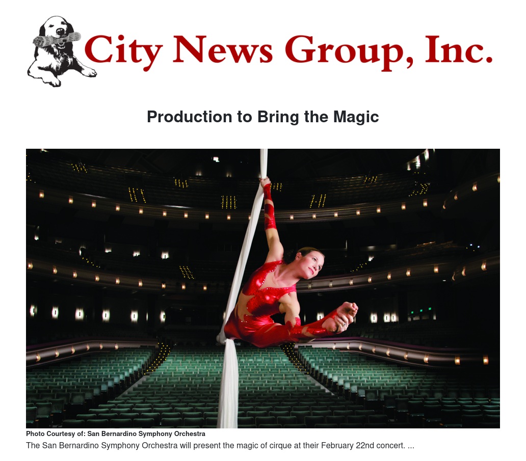 These Cirque artists will share the stage with San Bernardino Symphony Orchestra members in front of – and sometimes above – the musicians, with choreography that perfectly matches each musical arrangement. The cirque feats contribute to the spirited performance of the orchestra, providing a visual enhancement to the magnificence of a live symphony concert.