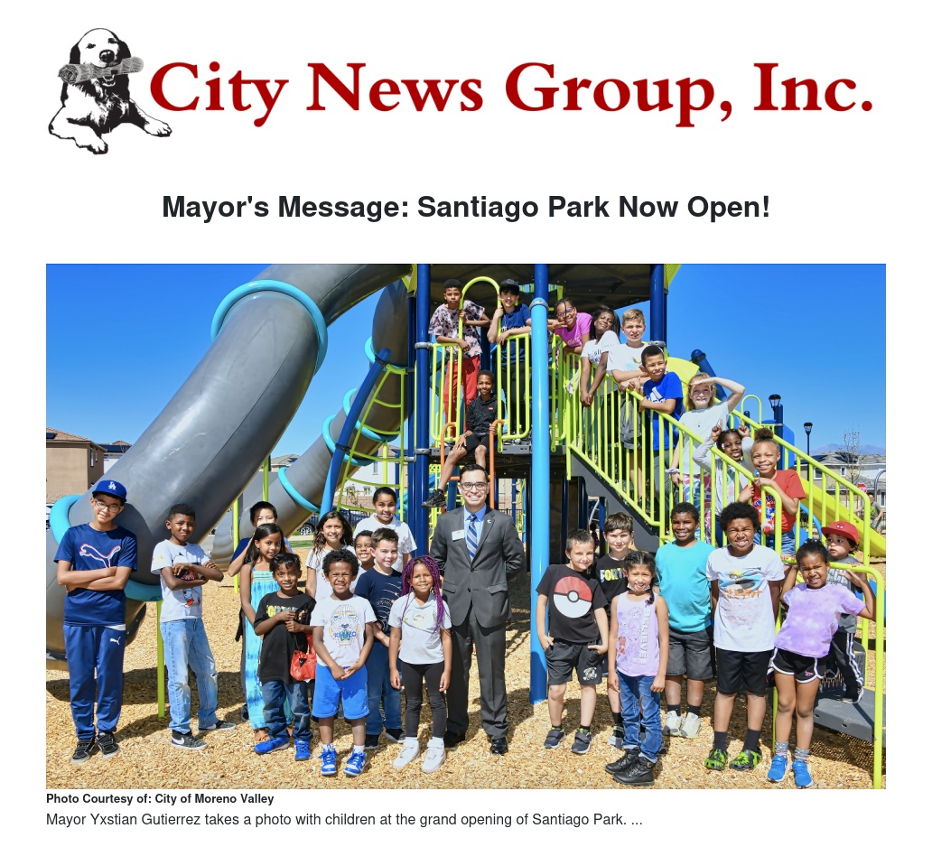 Mayor's Message: Santiago Park Now Open! by Mayor Yxstian Gutierrez - City News Group, Inc.