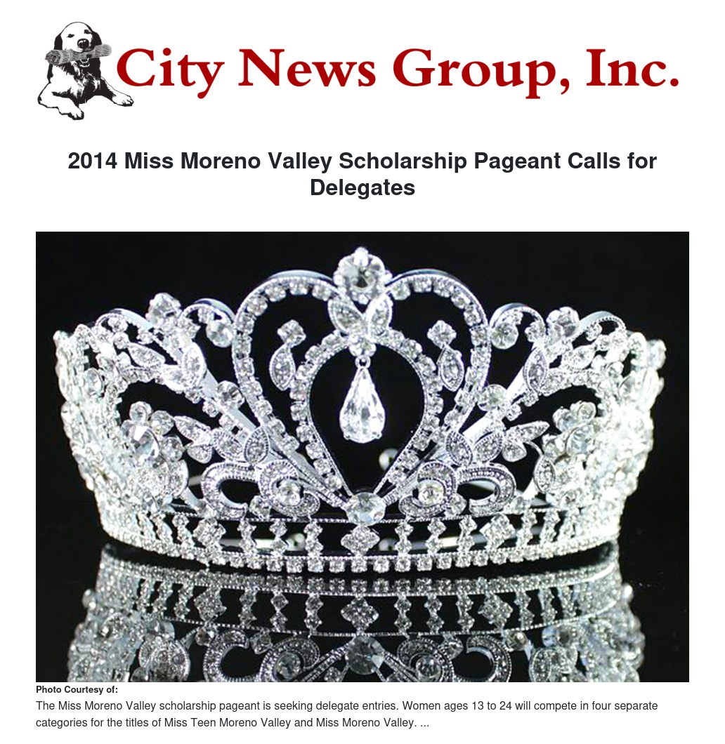The Miss Moreno Valley Scholarship Pageant Program announces its call for 2014 delegate entries for the 2014 pageant to be held Feb. 16.