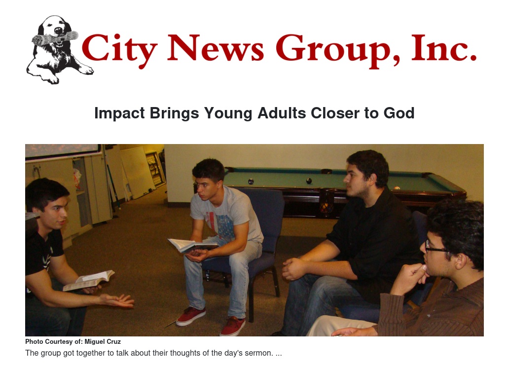 The group's pastor, Jim Spellman, who has been with the group since January explained the purpose of the group. "There are a lot of college students in the area; many go to Valley College, Cal State University San Bernardino, or University of Redlands." Spellman stated. "The years right after high school are an interesting time. There are a lot of challenges, questions, and doubts that young adults face during these years. Impact is a great place of support and prayer for young men and women to find their purpose in life."