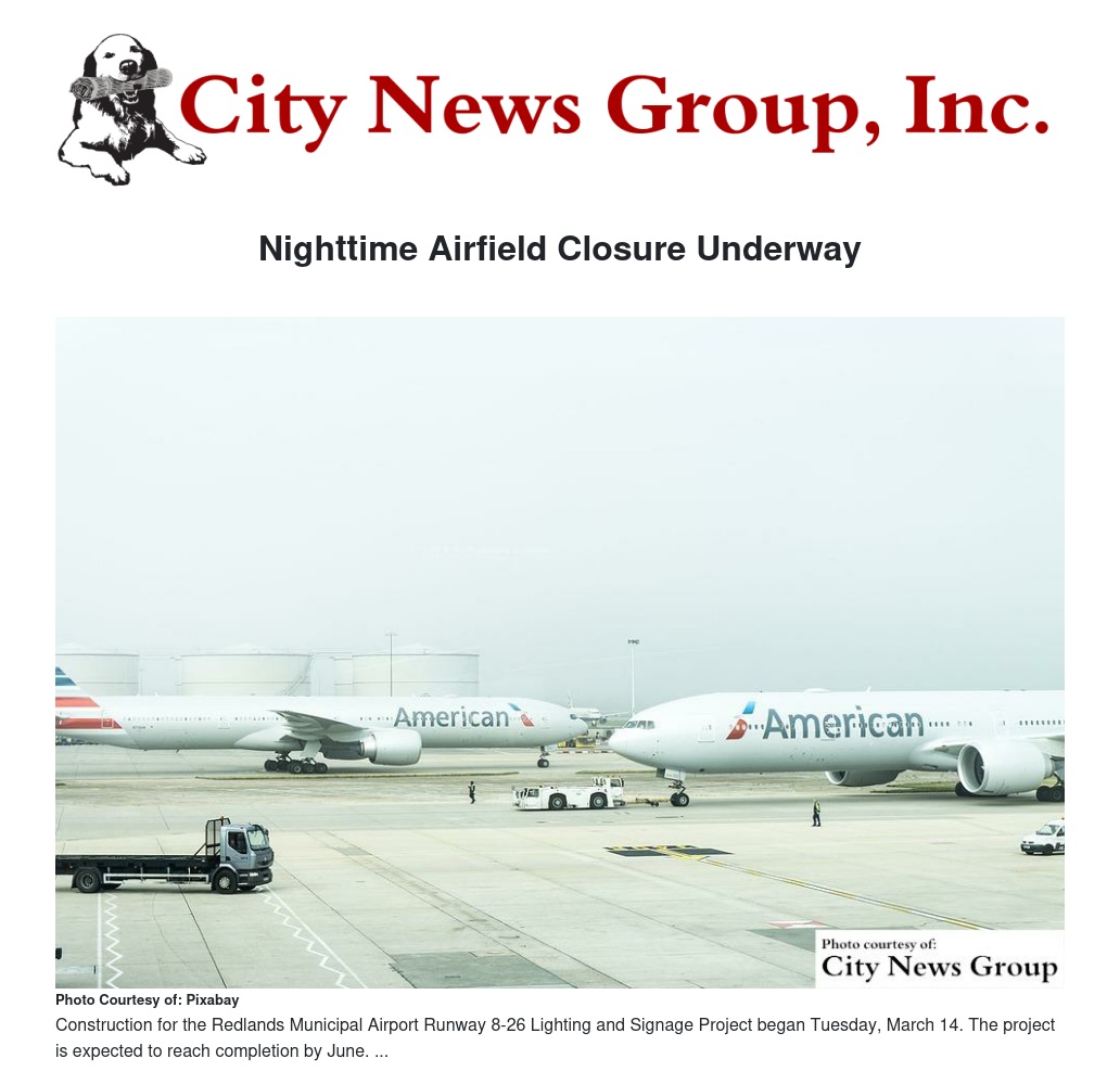 REDLANDS>> A full nighttime airfield closure at Redlands Municipal Airport began April 30 to allow for construction and installation of airport lighting and signage. The runway and taxiway will be closed and no aviation activity will be permitted between the hours of 8 p.m. and 7 a.m, Sundays through Thursdays. The airfield will be open Friday and Saturday evenings. The closure is expected to last through May 23.