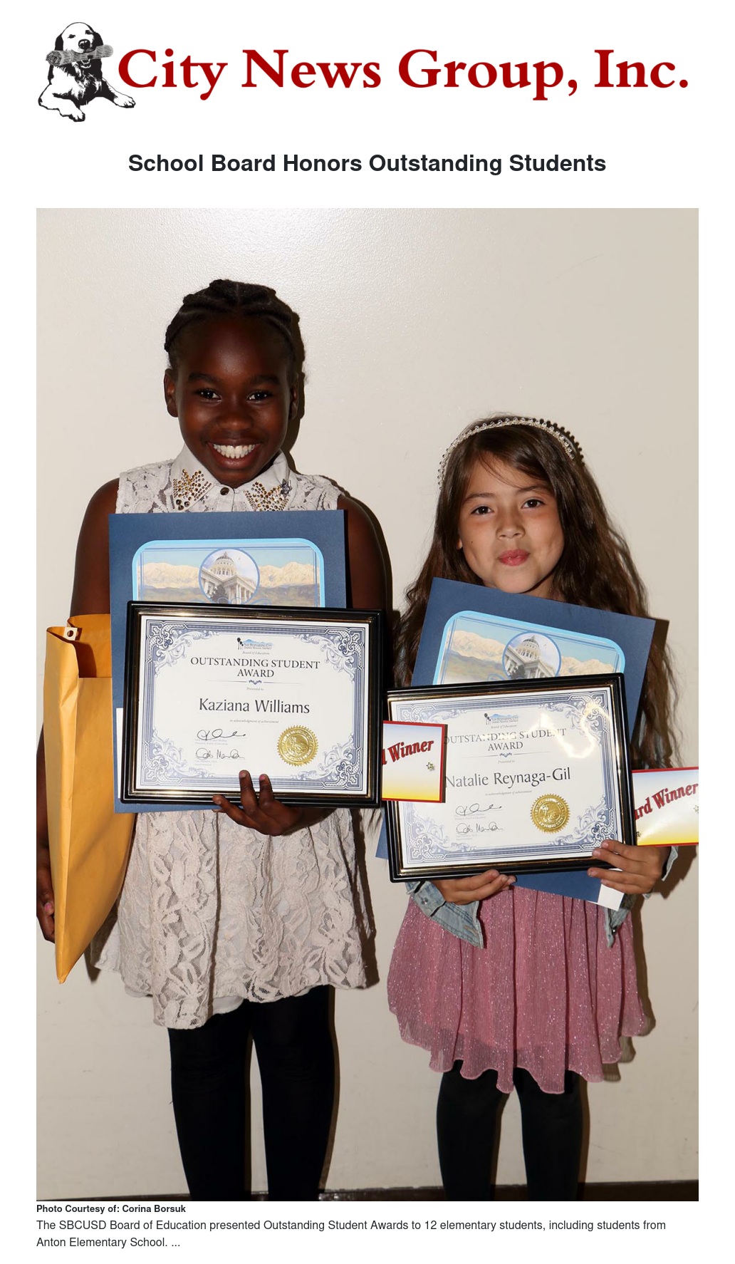The San Bernardino City Unified School District Board of Education honored 12 students with Outstanding Student Awards at the October 16, 2018, Board meeting. The San Bernardino Symphony also recognized students by providing them and their families with free symphony tickets.