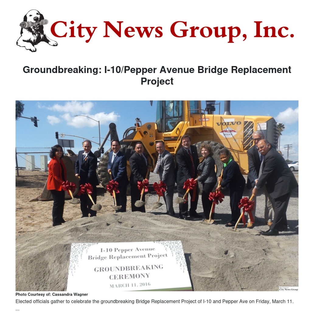 On Friday, March 11 the San Bernardino Associated Governments (SANBAG), the City of Colton, and the California Department of Transportation celebrated the start of construction for the Interstate 10/Pepper Avenue Interchange Improvement Project with elected officials representatives and community members.