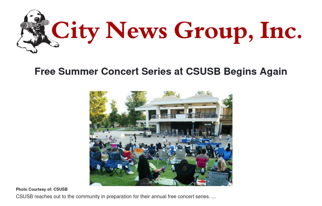 For more than 25 years, Cal State San Bernardino has held an annual series of free outdoor concerts each Wednesday night during the summer. Since its inception, over 70,000 listeners have enjoyed more than 100 acts.
