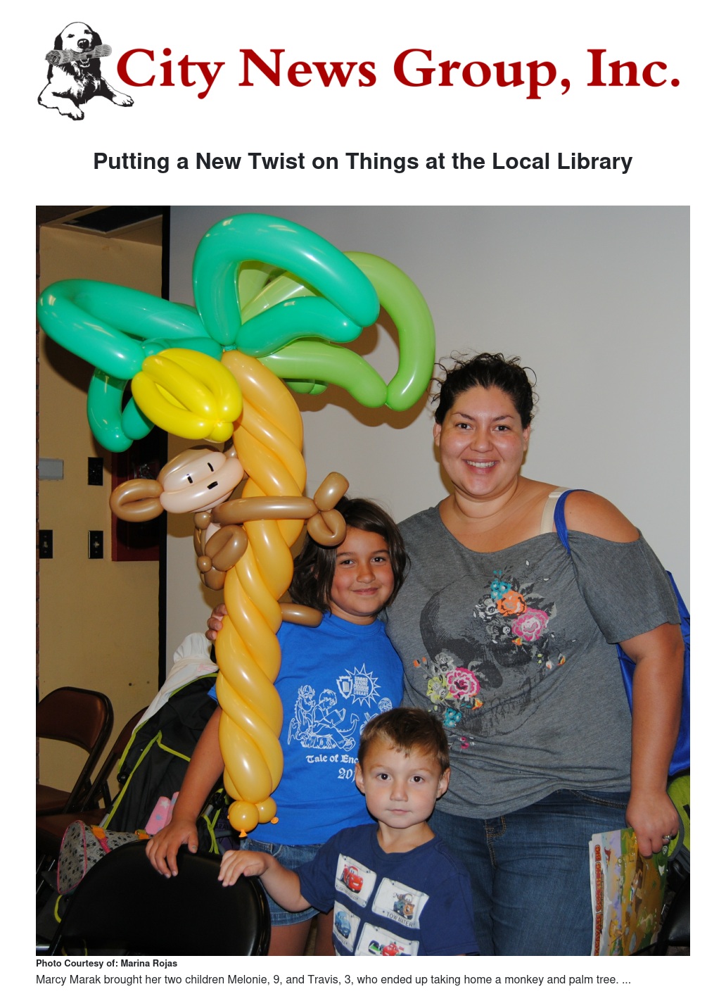 “He’s everyone’s favorite,” said Library Assistant Jennifer Palma. “Every time he comes, it’s packed.” The room was overflowing with families who had come to watch the Buster Balloon Show, courtesy of the Friends of the Library and the Summer Reading Program.