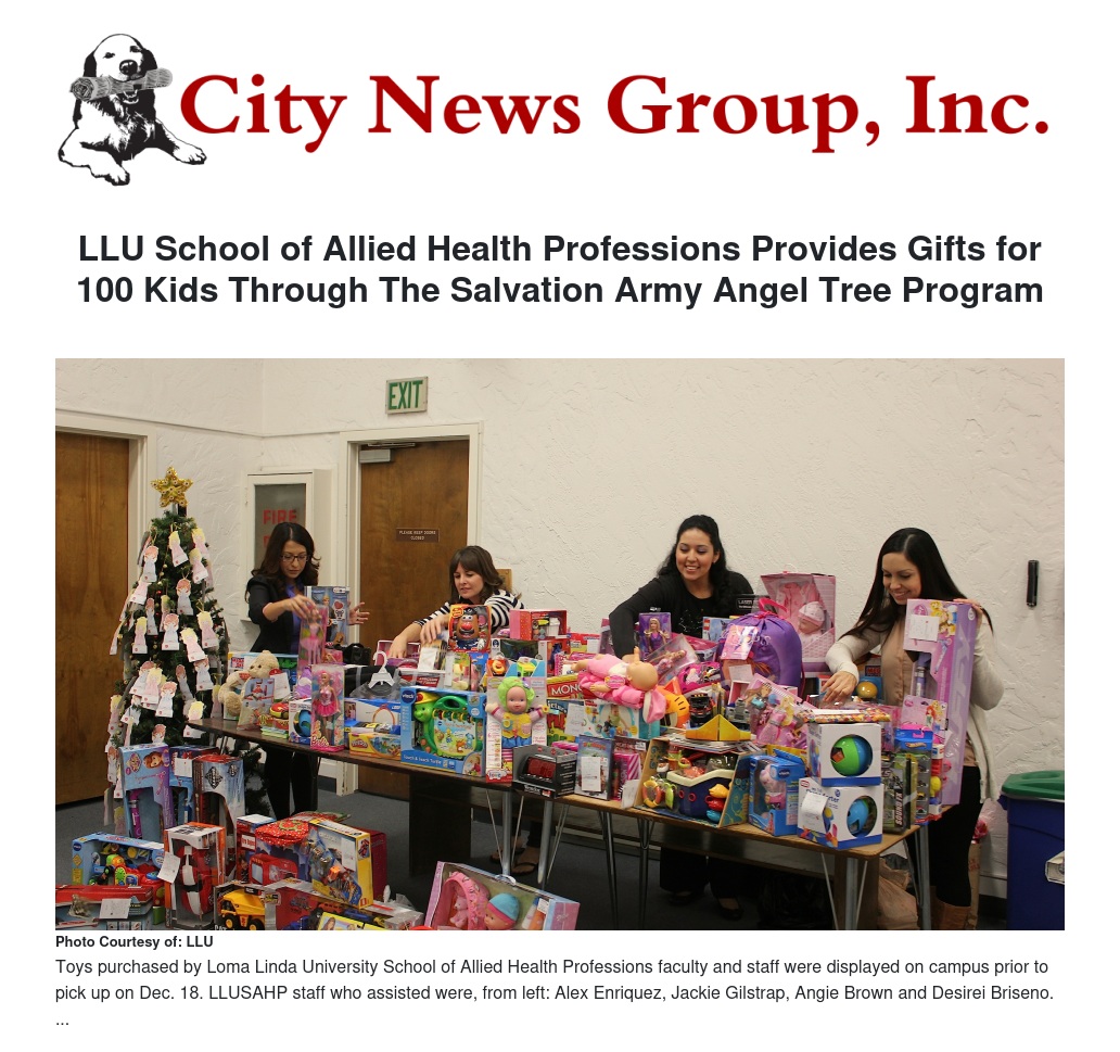 Faculty and staff from Loma Linda University School of Allied Health Professions (LLUSAHP) provided gifts for 100 disadvantaged kids through The Salvation Army Angel Tree programs for the tenth year in a row. The Salvation Army picked up the gifts — which consisted of toys, games, DVDs and electronics — at the school on Dec. 17.