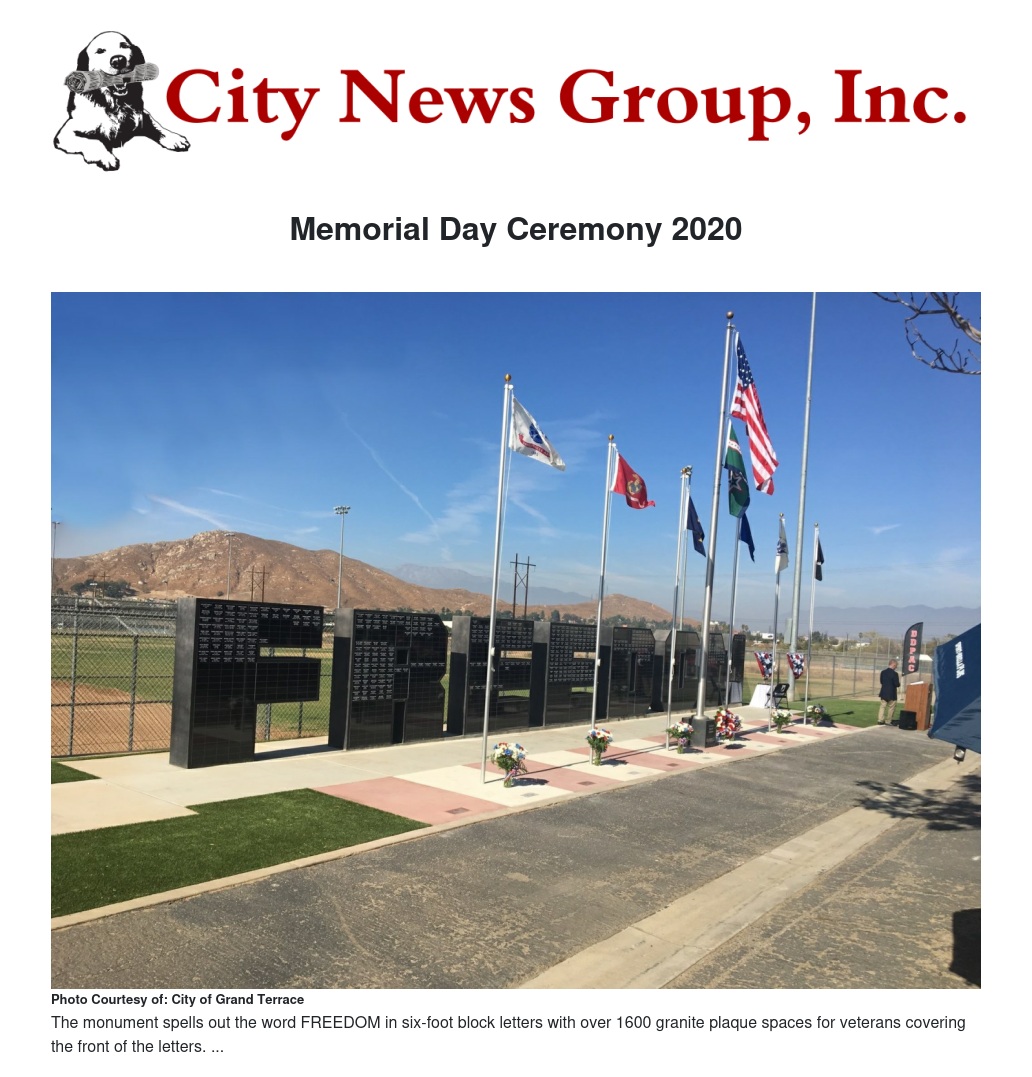 The Veterans Wall of Freedom Organization and the Foundation of Grand Terrace regretfully announce the cancellation of the Memorial Day Ceremony that was scheduled for May 25, 2020, at the Veterans Wall of Freedom in Grand Terrace, California.