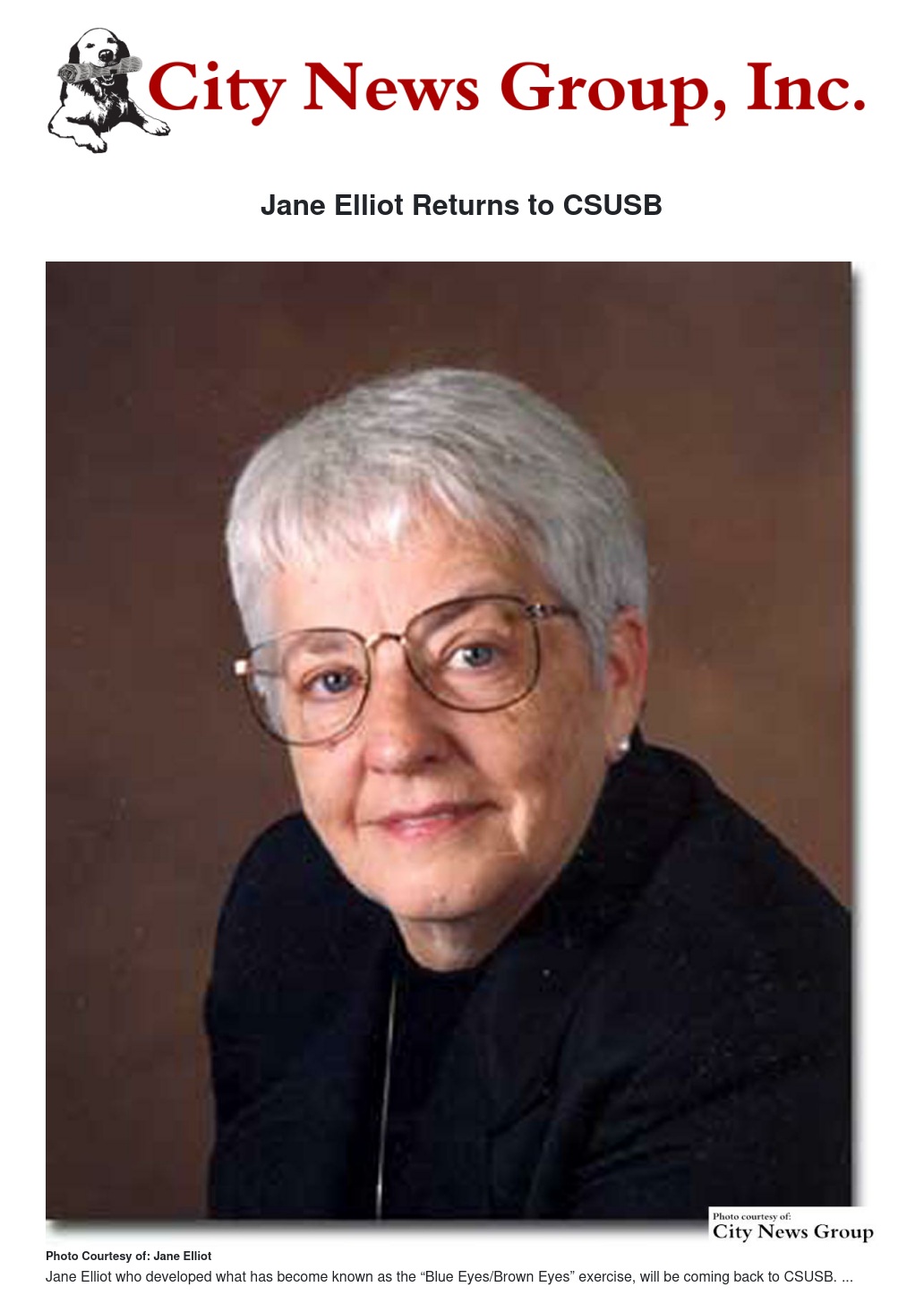 SAN BERNARDINO >> Jane Elliott, who in 1968 developed a classroom experiment for her all-white class of third graders to teach them about discrimination and racism by separating those with blue eyes from those with brown eyes, will speak at Cal State San Bernardino on Thursday, April 7.