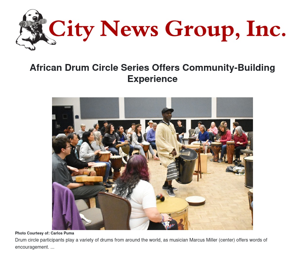 University of Redlands students, faculty, staff, and members of the community filtered through the doors of University Hall on the main Redlands campus January 31 to take part in an African drum circle. The event, which is the first in a series of similar gatherings to be hosted by the U of R's Meditation Room Program, offered a hands-on, intergenerational community-building experience and was led by musician Marcus Miller, who has been facilitating drumming events for the past 20 years. Ranging in age and level of experience, participants played a variety of drums from around the world as Miller weaved through them, offering words of encouragement and assistance. Upon returning to the center of the circle, he played complementary percussion instruments to add layers to the rhythm.