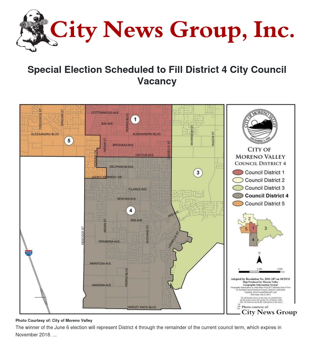 MORENO VALLEY>> The City of Moreno Valley will hold a special election on Tuesday, June 6, 2017 to fill the remaining term of the District 4 seat on the City Council. The vacancy was created when Dr. Yxstian Gutierrez, who represented District 4, was elected as the city's first directly-elected mayor on Nov. 8, 2016.
