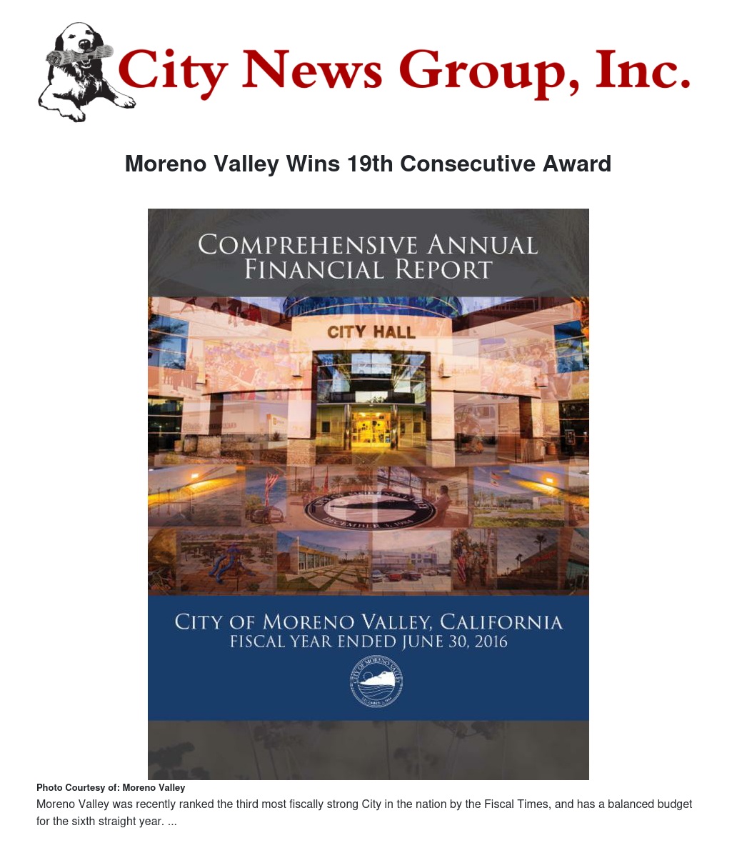 MORENO VALLEY>> The City of Moreno Valley has been awarded the highest form of recognition for governmental accounting and financial reporting for its FY 2015/16 comprehensive annual financial reporting (CAFR). The CAFR contains detailed information such as financial highlights such as balance sheets or debt increases from project funding, as well as overviews of financial statements