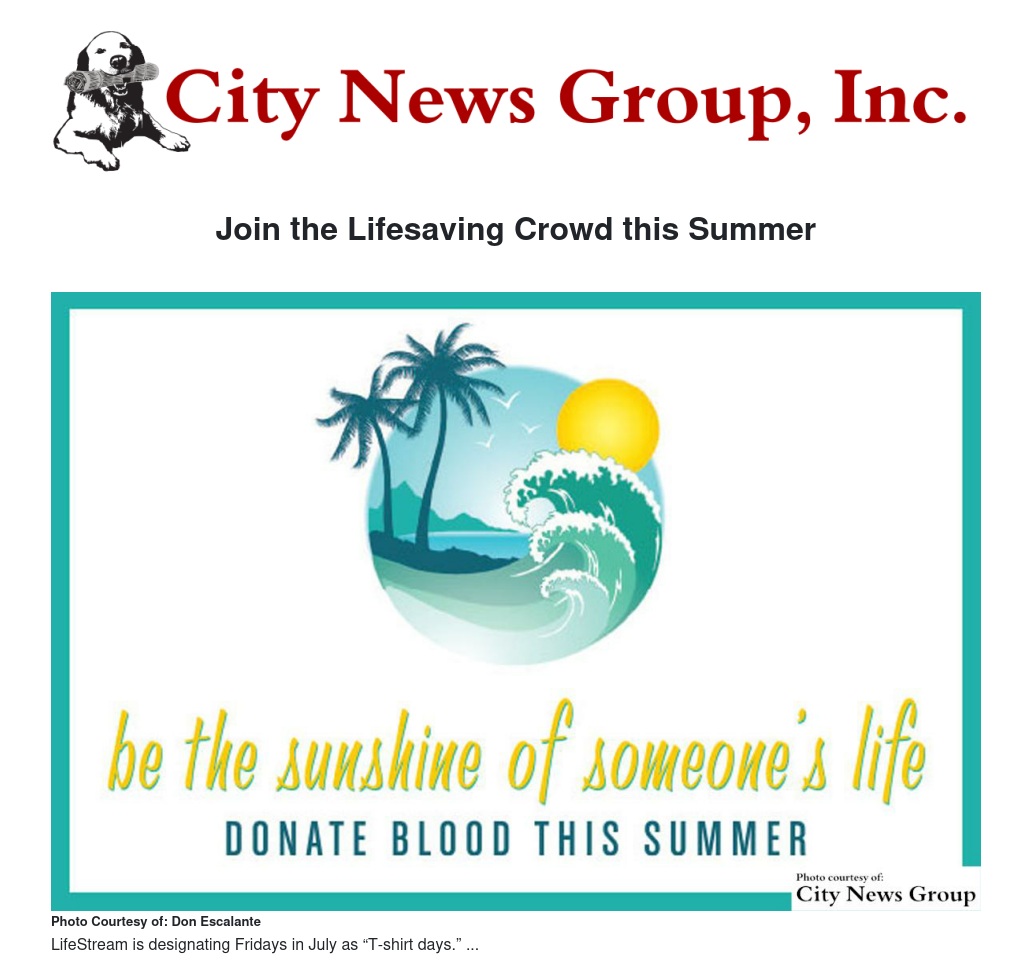 LifeStream is designating Fridays in July as “T-shirt days.” Donors at all locations July 17, 24 and 31 receive a special edition, summertime-themed (“Be the sunshine of someone’s life”) T-shirt or ladies’ tank top.