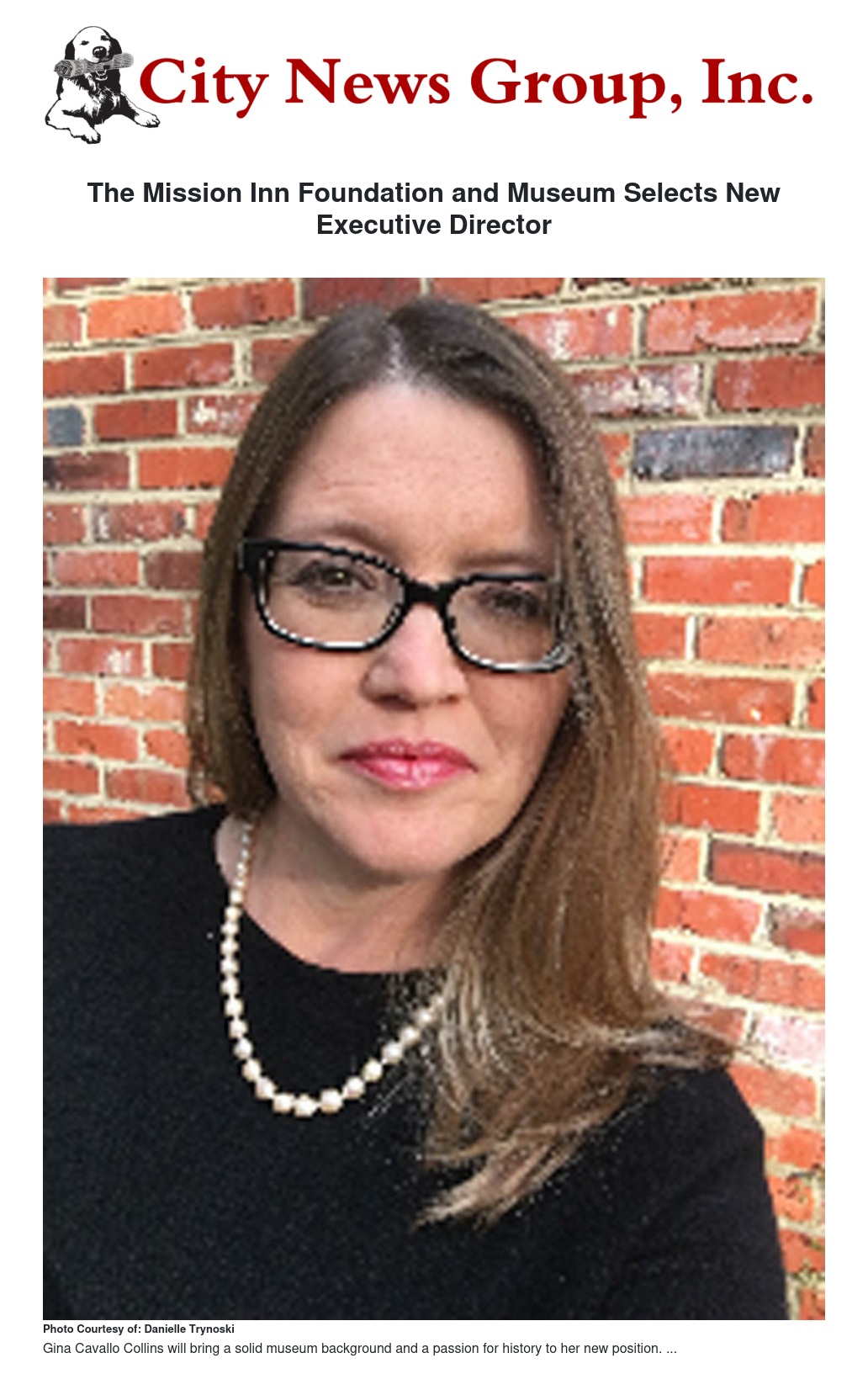 The Board of Trustees of the Mission Inn Foundation proudly announces the selection of museum professional Gina Cavallo Collins as Executive Director of the Mission Inn Foundation. She replaces current director Steve Spiller who is retiring the end of January 2018 after 15 and a half years with the Foundation. With a career spanning 30 years, 7 institutions, and a broad range of roles, Gina Cavallo Collins brings a solid museum background and a passion for history, non-profit management, and community engagement. Past positions include registrar and curator at the Heard Museum, the Shemer Art Center and Museum, and the Scottsdale Museum of Contemporary Art in the Phoenix, AZ area; statewide exhibitions coordinator at the Virginia Museum of Fine Arts and gallery manager at the Visual Arts Center of Richmond in Richmond, VA; and gallery director/curator as well as adjunct faculty at Randolph-Macon College in Ashland, VA. She has also been a small business owner for over 20 years, serving as the administrator and CFO for Victory Farms, Inc. in both Phoenix and Virginia.
