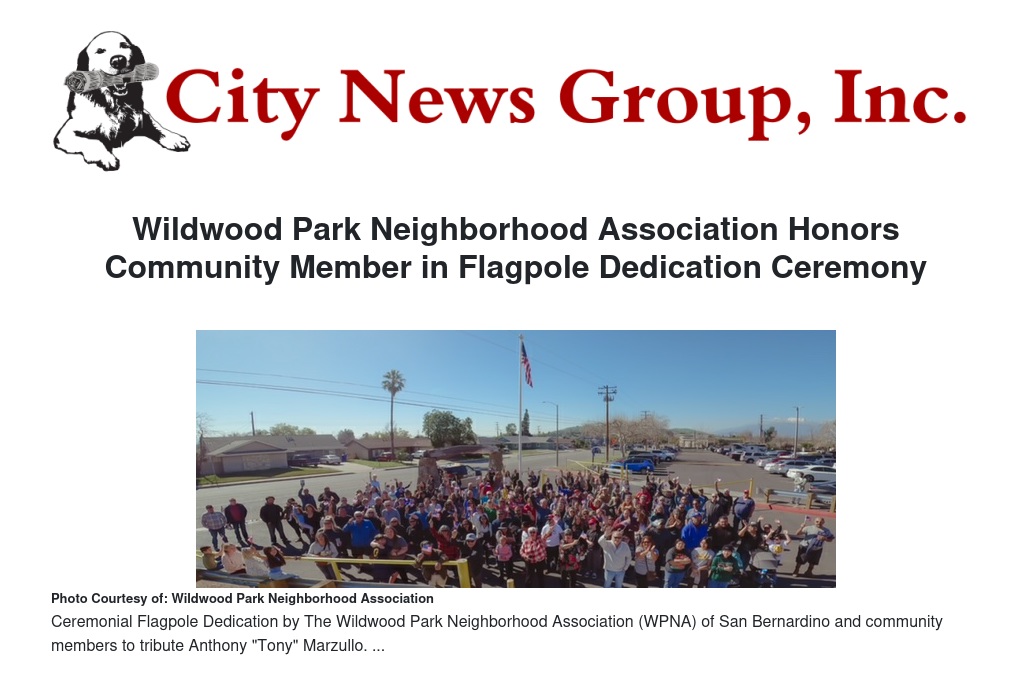 The Wildwood Park Neighborhood Association (WPNA) of San Bernardino, California recently paid tribute to Anthony "Tony" Marzullo, their past president, and community member of WPNA. A ceremony dedicating the flagpole to Tony's memory was held on Saturday, January 28, where 150+ family, friends, co-workers, City dignitaries and community members gathered to honor him. Tony gave selflessly to his community, working in partnership for many years with others to improve the ball fields and park grounds of Wildwood Park. He led the WPNA for a decade until his untimely passing in March of 2022.