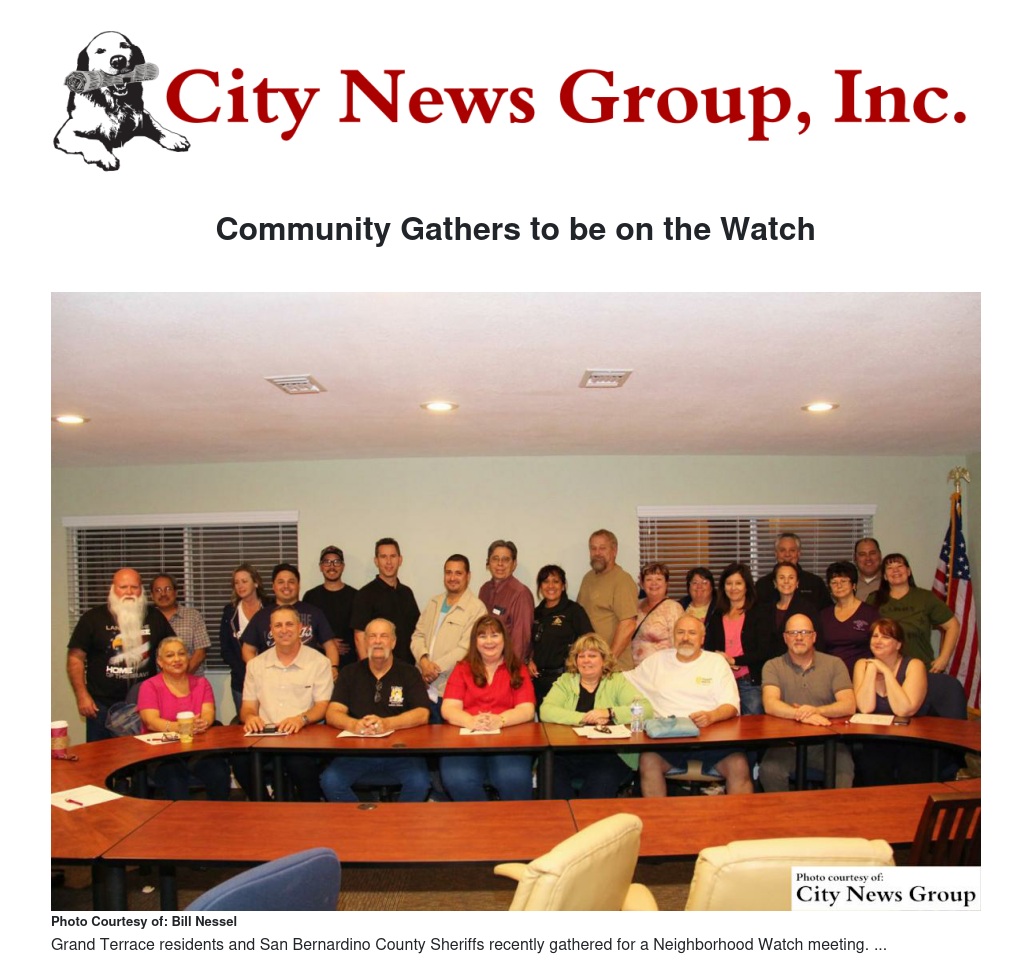 Meeting attendee and retired San Bernardino County Sheriff’s Officer Bill Nessel, who worked in the Department for 23 years and has called Grand Terrace home for 17 years, said, “I attended because I like the concept and wanted to help publicize it. Very good turn out and information was well received. I think if everyone gets on the bandwagon and 'Talks the talk and walks the walk' this will be a very good thing for our city.”