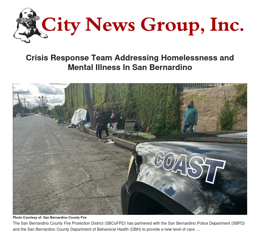 The San Bernardino County Fire Protection District (SBCoFPD) has partnered with the San Bernardino Police Department (SBPD) and the San Bernardino County Department of Behavioral Health (DBH) to provide a new level of care for members of the community who are experiencing a mental health crisis. The Community Outreach and Support Team (COAST2) is a multi-disciplined Crisis Response Team created to address the increasing numbers of homeless and permanent residents that suffer from mental illness.