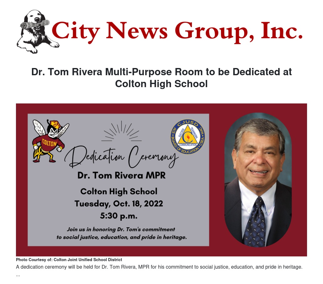 Dr. Tom Rivera Multi-Purpose Room to be Dedicated at Colton High School by Anna P. Duff - City News Group, Inc.