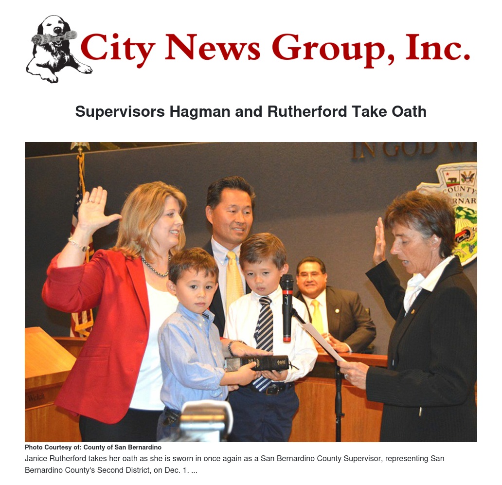 Supervisors Curt Hagman and Janice Rutherford spoke of teamwork as they began new four-year terms on the San Bernardino County Board of Supervisors following Oath of Office ceremonies at the County Government Center Dec. 1.