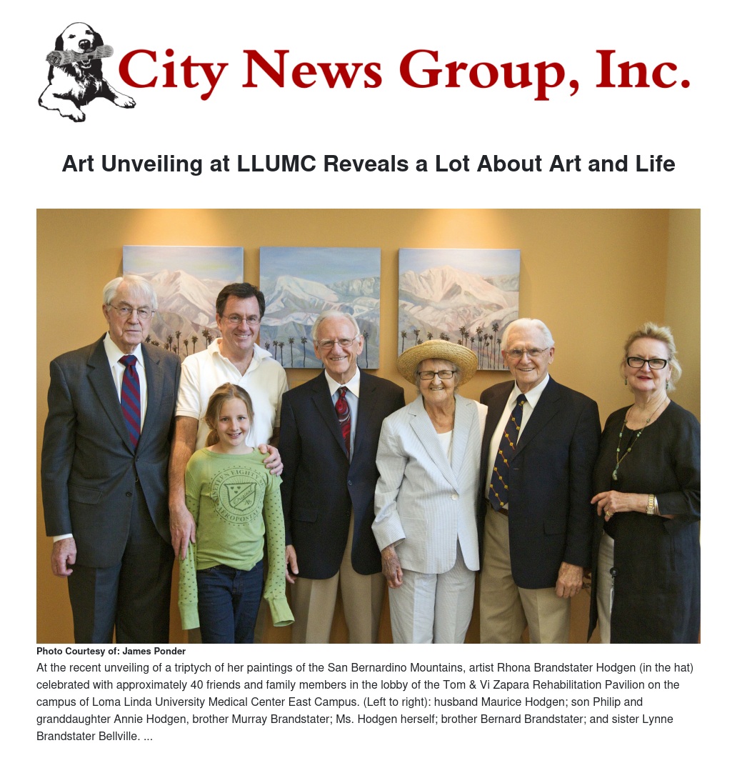 The formal unveiling of a triptych of oil paintings donated to the Zapara Rehabilitation Pavilion at Loma Linda University Medical Center's East Campus reveals as much about octogenarian artist Rhona Brandstater Hodgen’s philosophy of life and art as it does about the pictures on display.