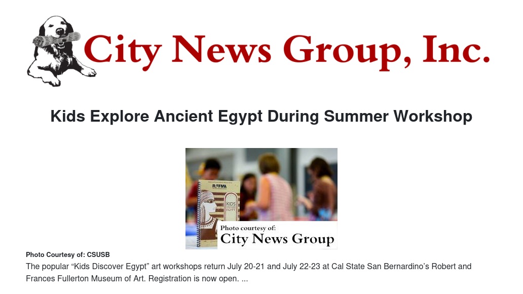 Clay art projects inspired by ancient Egypt are just some of the activities lined up for the popular “Kids Discover Egypt” art workshops July 20-21 and July 22-23 at Cal State San Bernardino’s Robert and Frances Fullerton Museum of Art.