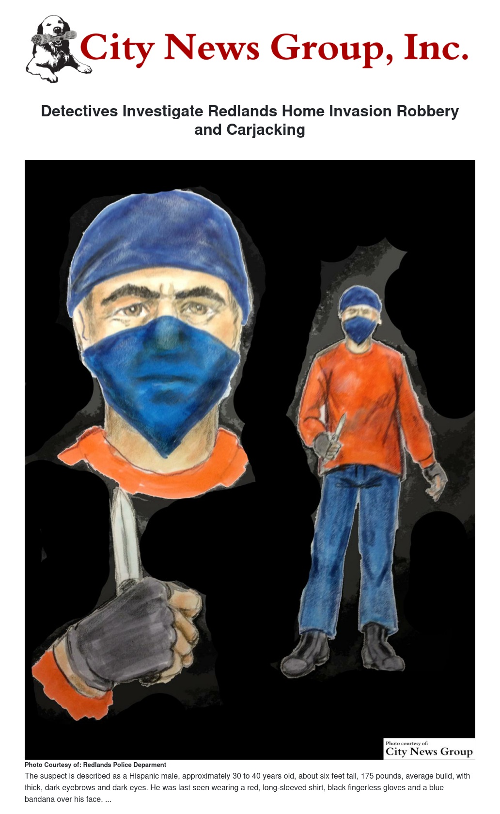 Police said the suspect is a Hispanic male, approximately 30 to 40 years old, about six feet tall, 175 pounds and of average build, with thick, dark eyebrows and dark eyes. He was last seen wearing a red, long-sleeved shirt, black fingerless gloves and a blue bandana over his face.