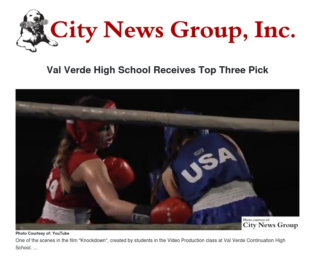 MORENO VALLEY >> The Val Verde Unified School District is proud to announce that Val Verde High School has been selected as a finalist for the 2016 Panasonic Kid Witness News, New The video "Knockdown" produced by the Video Production class at Val Verde Continuation High School was one of three videos selected by Panasonic for the 2016 New Vision Awards.