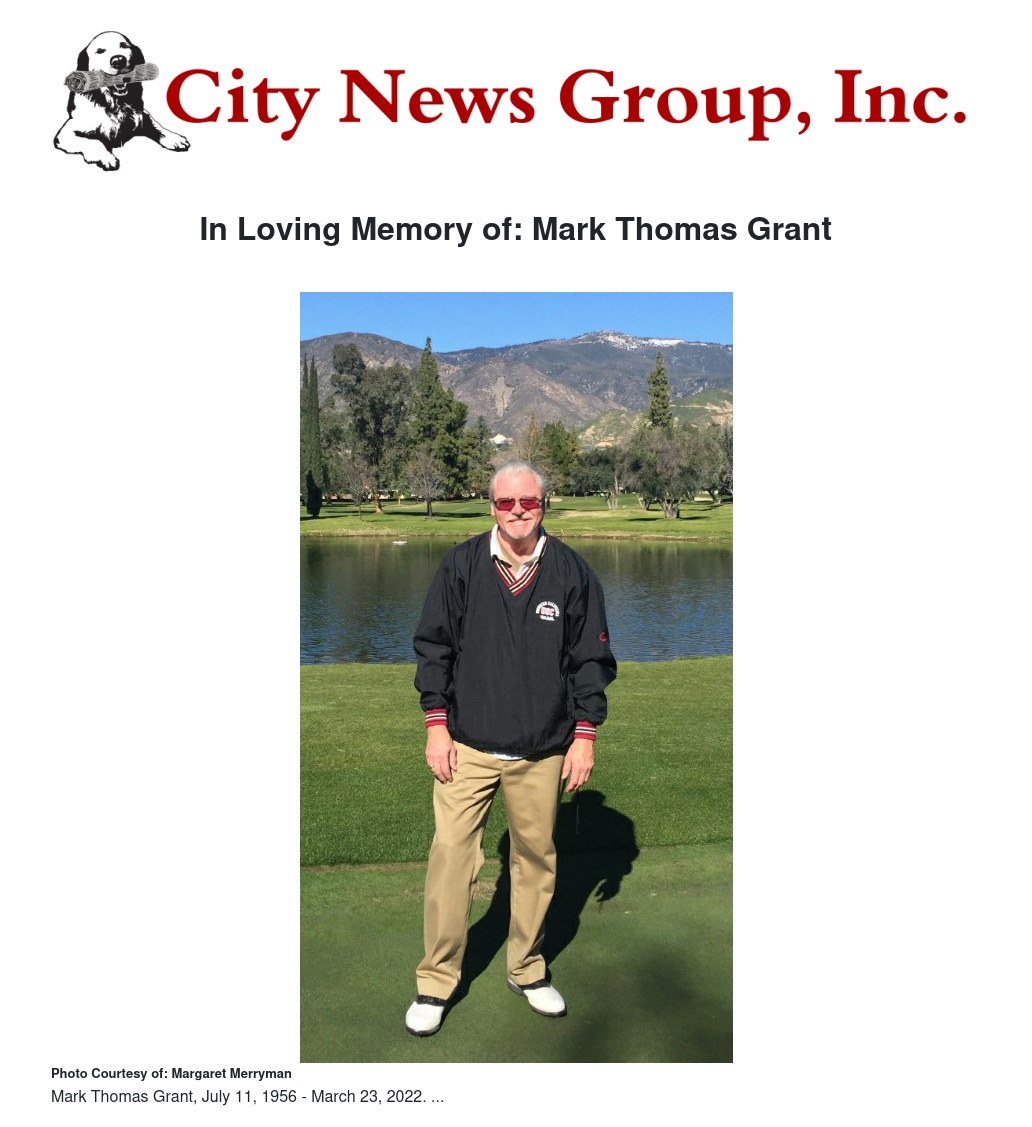 Mark Grant, a longtime resident of Grand Terrace, passed peacefully at home surrounded by family. Mark was born in Cincinnati, Ohio. Mark Grant is survived by his soulmate, Peggy Merryman, his loving canine companion Molly, son Aaron (Angeliene) Grant, stepsons Josh (Elvira) Zink, Jeremy (Alaina) Zink, brother Jerry (Lou) Grant of Cincinnati, sisters Julie Hurts of Cincinnati, and Toni Arnsperger of Ft. Mitchell, KY, grandchildren, nieces, and nephews. Preceded in death by his brother Tony Grant of Loma Linda.
