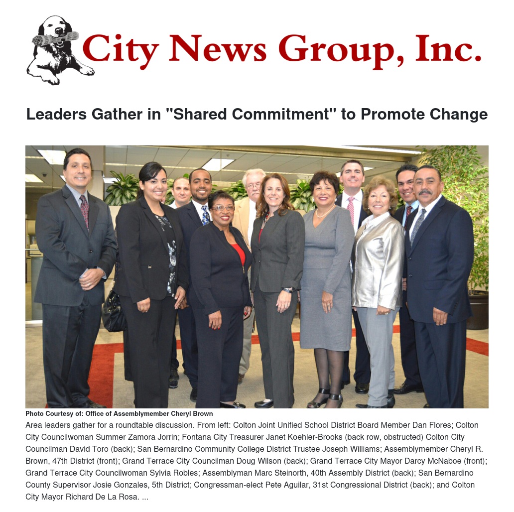 “At this critical moment that we face as a county, it’s very important to have a shared vision of the future,” Assemblymember Brown told leaders during a round-table discussion held at the San Bernardino County Government Center. “We must solve some of our greatest issues and problems, which include bankruptcy, economic decline, high unemployment, homelessness and persistent problems impacting the quality of education in our schools. By coming together and working cooperatively, we can bring more resources to help our constituents succeed and prosper.”
