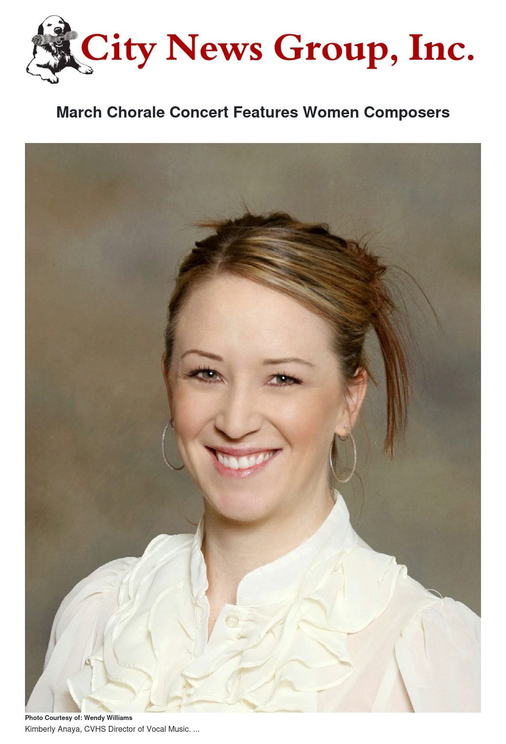 Under the direction of Kimberly Anaya, Citrus Valley High School’s Lumiere de Chanson will present five pieces including Alice Parker’s “Hark, I Hear the Harps Eternal,” and “Angele Dei,” by Susan LaBarr. The students will combine with the Chorale on “Journey Home,” by Amy Betinis. Soloists on “Journey Home” are Susan Meinders and Rick Wood.