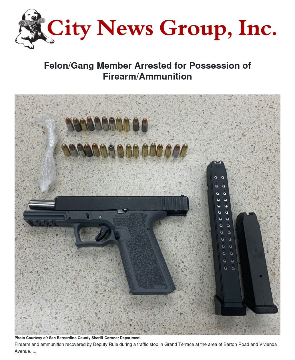 INCIDENT: PC 29800(A)(1)-Felon in Possession of a Firearm; PC 30305(A)(1)-Felon in Possession of Ammunition; H&S 11370.1(A)-Possession of a Controlled Substance with Access to a Loaded Operable Firearm; PC 25850(C)(3)-Gang Member in Possession of a Loaded Firearm; and PC 25850(C)(6)-Possession of an Unregistered Loaded Firearm
