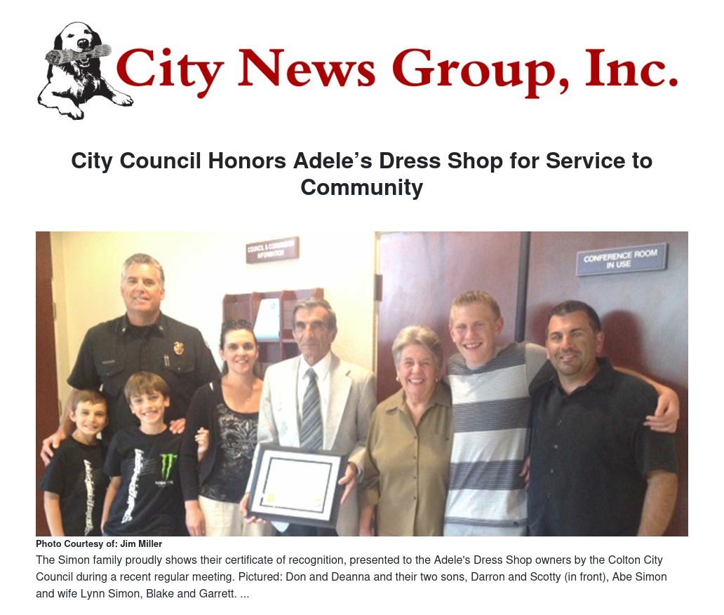 The March 2014 award is not the only award the business has received; in 2005, Adele’s Dress Shop and the Simon family were honored by the City of Colton with the “Business in the Spotlight” award for that year.