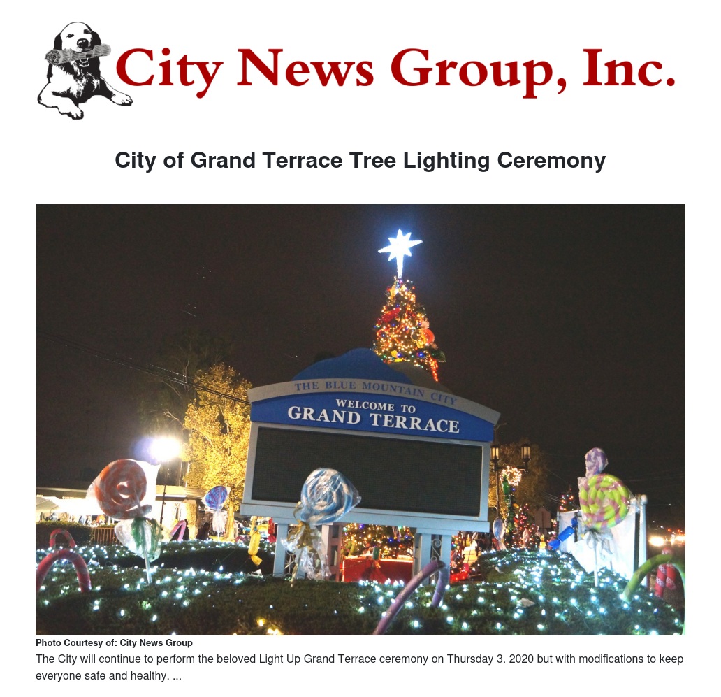 Due to COVID-19, the Light It Up Grand Terrace event will be modified this year. The Mayor and City Council Members will light the City's Holiday Tree on Thursday, December 3, 2020 at 6:30 p.m. Staff will broadcast the event on "Facebook Live". In addition, during the same time the Mayor and City Council are lighting the Holiday Tree, pre-recorded performances from community groups will be broadcast on Channel 3, as a virtual celebration of the holiday season.